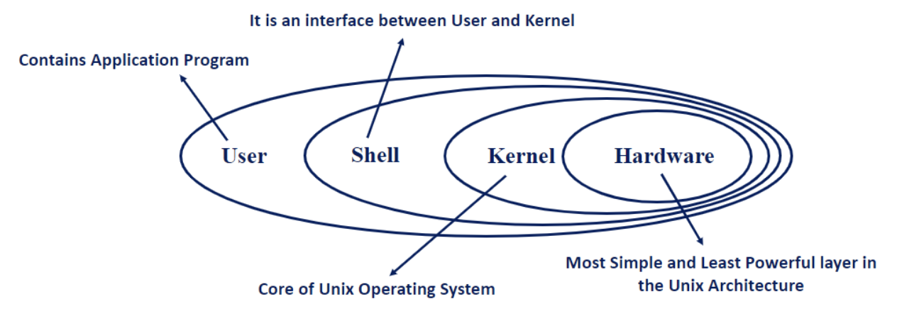 쉘은 사용자가 운영체제의 서비스를 사용할 수 있도록 사용자의 입력을 기반으로 프로그램을 실행해 주는 역할을 한다. 즉, 커널과 사용자 사이의 인터페이스 역할을 담당합니다. (쉘은 OS 외부 계층에 속해있다)