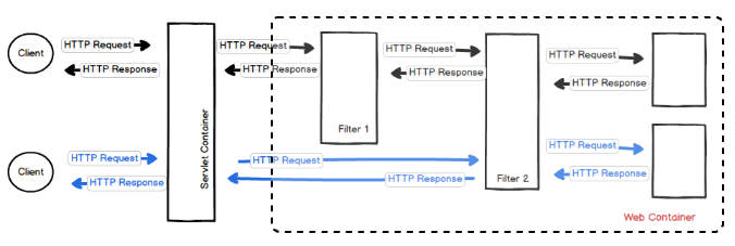 Filter는 애플리케이션 레벨에서 로그인, 시큐리티, Jwt 등 구현을 하다 보면 Dispatcher Servlet에 도달하기 전 요청에서 토큰 검사 등 유효성 검사를 처리하기 위해 사용되며 Chaining 방식으로 여러 개의 필터를 설정할 수 있습니다.
