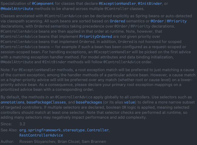 ControllerAdvice 어노테이션을 살펴보면, 대상을 지정하지 않은 모든 컨트롤러에 @ExceptionHandler와 @InitBinder의 기능을 적용해 준다고 합니다.