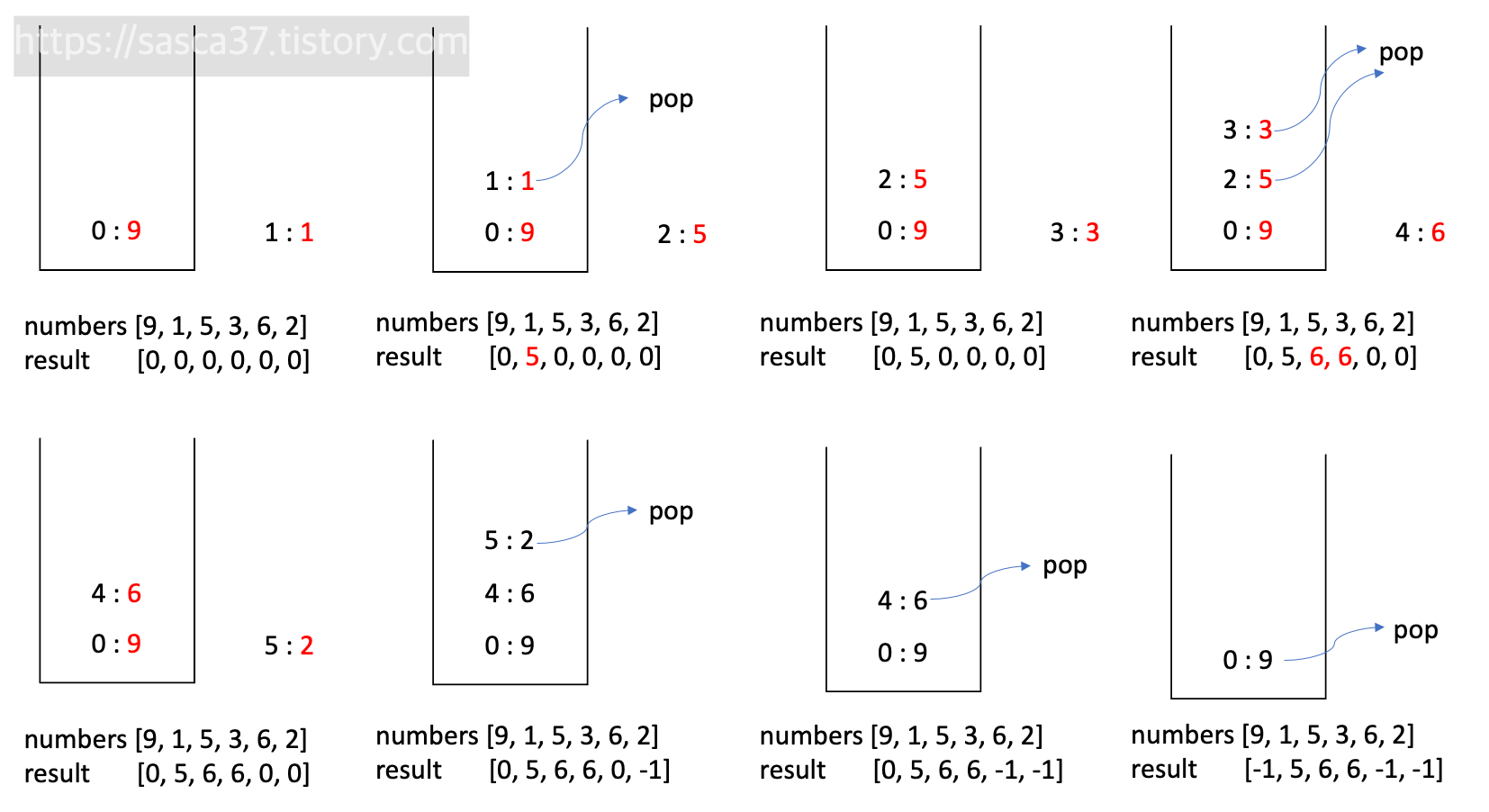 순회하면서 현재 값 (numbers[i])이 스택에 최상단 (stack.peek()) 값보다 크면 뒤에 있는 큰 수에 해당합니다. 해당 경우에 하위 스택 원소들도 탐색해 보면서 추가로 해당하는 원소가 있는지 판별 후 있다면 pop 해주면서 인덱스에 정답 값을 넣어줍니다.
