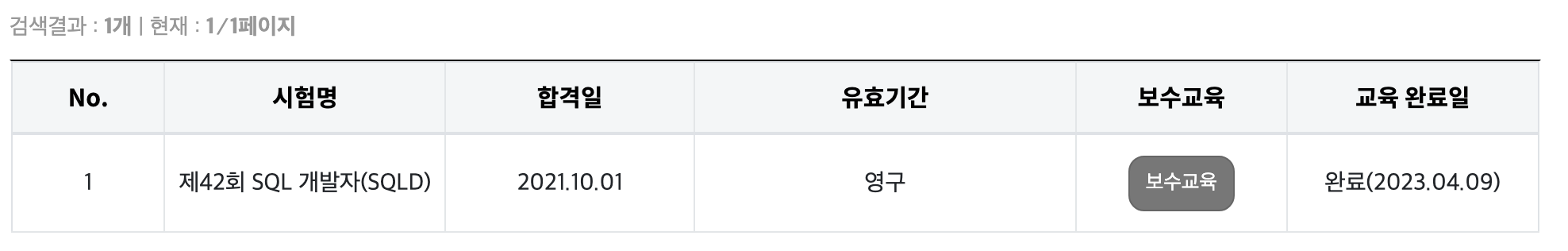 SQLD 자격증은 2년간 유효한 자격증으로 합격일로 부터 1년 6개월 이후부터 보수교육을 들어야지만 영구 자격증이 됩니다. 보수 교육을 듣지 않고 2년이 지나면 자격증 효력이 사라집니다.