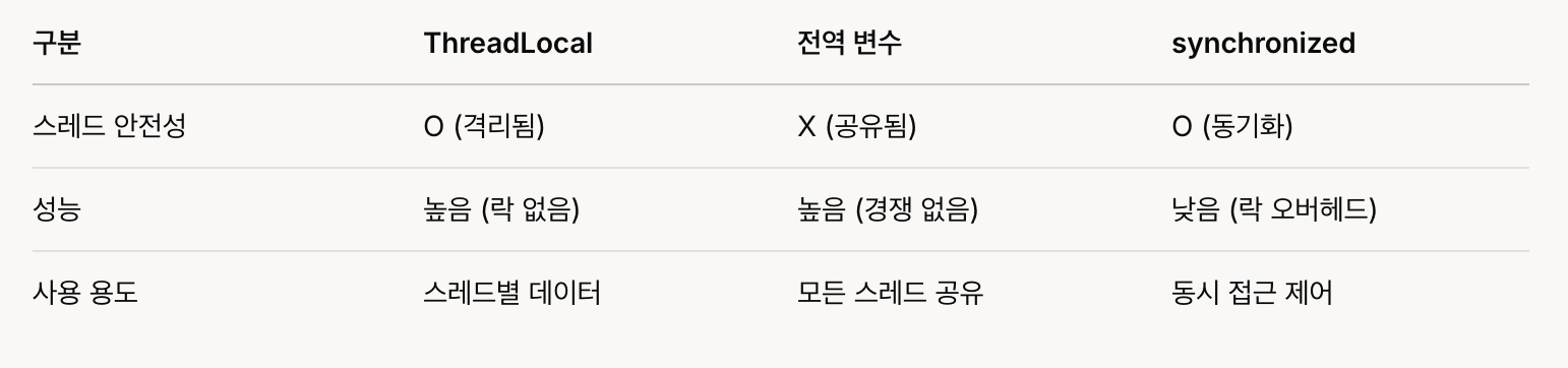쉽게 말해, ThreadLocal은 "스레드마다 개인 사물함을 주는" 개념이라고 생각하면 됩니다. 각 스레드가 자신의 사물함에 데이터를 넣고 꺼낼 수 있지만, 다른 스레드의 사물함에는 접근할 수 없습니다.